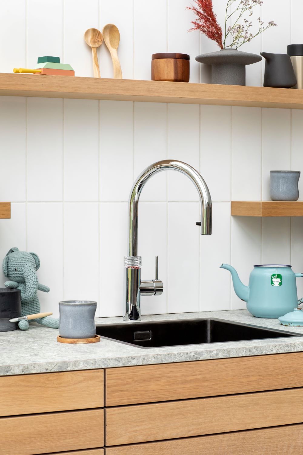 A Quooker system consists of a tap on the worktop and a tank in the cupboard underneath.