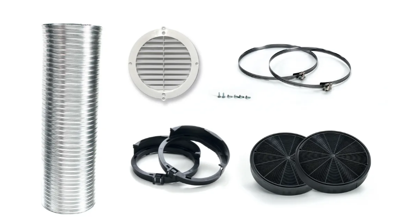 • Consisting of: 2 charcoal filters, charcoal filter support, deflector, flexible hose ø 150 mm and 1500 mm long, 2 clamps, mounting material