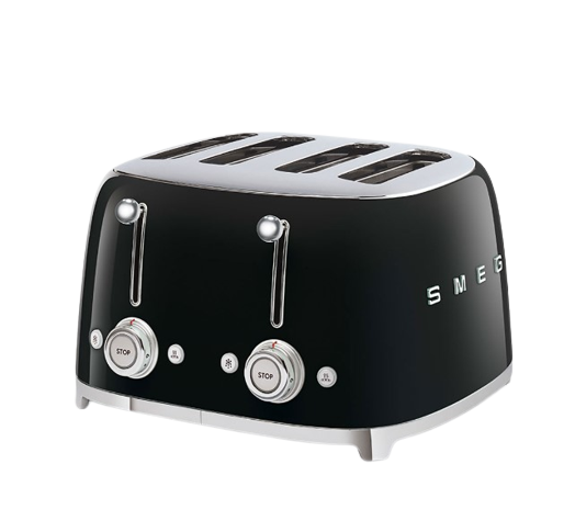 Smeg's four-slot toaster has six browning levels and three pre-set programmes for reheating, defrosting, and bagel toasting, so you may toast your bread to your preferred amount of browning (single side).
