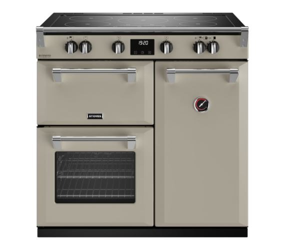 90cm electric induction range cooker with a 5 zone touch control hob, conventional oven & grill, multifunction main oven with TrueTemp digital thermostat, and tall fanned oven with PROFLEX™