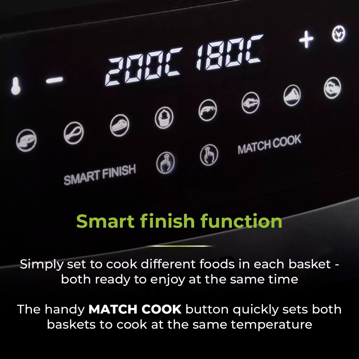 The handy match cook button quickly sets both baskets to cook at the same temperature.