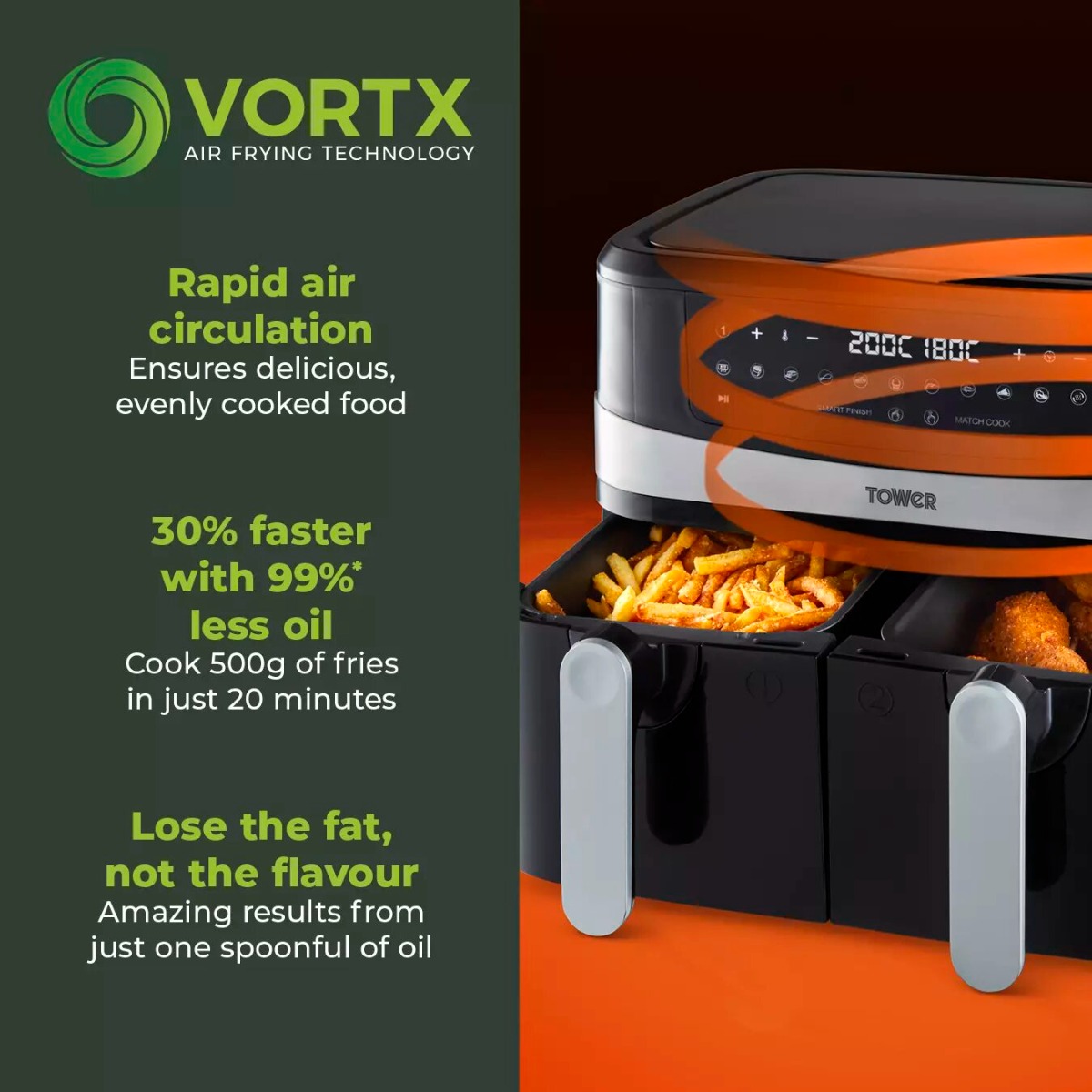Its quick and easy to cook a range of delicious recipes with this 9L Dual Basket air fryer. It uses rapid air circulation technology to cook food 30% faster and with 99% less fat from just one spoonful of oil. With Vortx frying, you lose the fat, not the flavour, cooking your ingredients with extra-crispiness and the same delicious fried taste. By switching to your air fryer, you can slash your energy by 50% energy as it uses less power than a conventional oven.